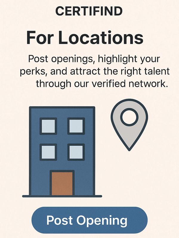 Professionals can build profiles, set their standards, and request access to opportunities that respect their time, experience, and worth. Organizations can list openings, share what makes them different, and connect only with professionals who match their values. With separate forms for talent and locations, CERTI-FIND STAFF ensures both sides of the pool meet on equal terms—so jobs find the right people, and people find the right jobs.